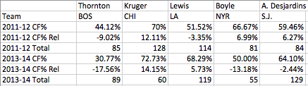 The final reason I chose offensive zone faceoff losses (or more strictly, the shot attempt differential in the subsequent 21 seconds) is because they require wingers like Thornton to exert forecheck pressure. Centers and defensemen generally are less important at keeping the puck in the zone than their wing counterparts in these situations. Here are Thornton’s numbers from the past two full seasons (considering the small sample sizes I felt using 2012-13 would be even less reliable) compared to some of the other prominent fourth liners from top teams. I’m not so sure “best fourth line in the league” was really an accurate claim.