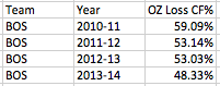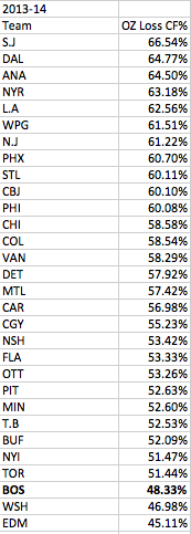 In analyzing Thornton, I decided to examine his performance following offensive zone faceoff losses for a few reasons. First off, enforcers are often given these minutes because coaches feel they need to be “sheltered”. The upside to sheltering fourth liners is that it’s less likely the players immediately get trapped in their own zone and/or scored upon. The opportunity cost, however, is that the team’s stars can’t take on these assignments and begin their shifts with direct opportunities to score. Second, despite the Bruins being a top possession team for the past number of years, they have traditionally ranked fairly low following offensive zone faceoff losses. This, of course, is only the fourth line’s fault to a small extent, but the gap was notable enough to investigate.