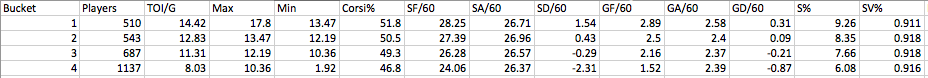 Here are the relevant columns of the first chart from that piece by Garret, which groups NHL players into buckets based on ice time. The total TOI/G at even-strength (these are all ES numbers) is 46:59, so I’m going to work under the assumption that that is approximately the amount of ES play per game. Any model for ice time needs to work within that parameter.