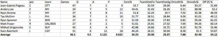 The list of players isn’t actually very important, as long as you’re willing to accept that some young player who may miss out because they don’t fit a fourth line role could potentially have a CF% of 50.25%, as well as the rest of the production you see above.