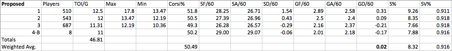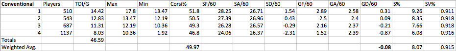 Disclaimer: The 54.12% offensive zone starts isn’t relevant to this illustration, but I will note that that number does confound the results somewhat, so it’s something for future examination. The conventional fourth liners likely – although not necessarily – have far lower OZS%s, and therefore their CF%s are bound to be lower. I don’t think that renders this study useless, but it’s something to be taken into account.
