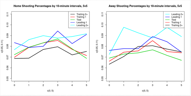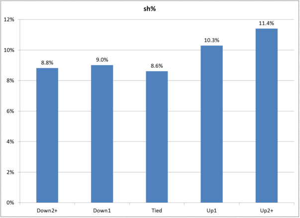 Sure, the shooting percentage when trailing is shown to be higher than that with the score tied right up until the end of regulation. But there’s a pretty logical reason for that as well. Teams tied near the end of regulation are playing for overtime. They are far more likely to dump shots from the blue line than to pinch to create opportunities. And both teams are far more worried about not allowing a goal against than scoring a goal for. There is massive loss aversion in play here; shooting percentage is bound to drop. You can’t compare the two situations because looming overtime (or more specifically the loser point) is a confounding variable.