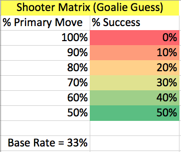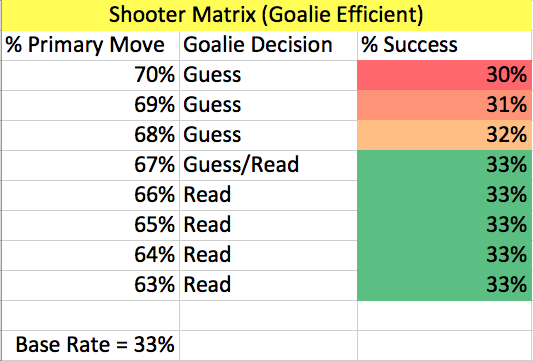 In the goalie plays you efficiently, however, these percentages won’t hold up because once your success rate gets to the base rate, he will change to reading you, and the base rate will hold. This is shown in the table below.