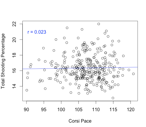 The big question the piece raised for me, however, was whether pace of play can have an effect on shooting percentage. After all, we know that the score can affect shooting percentage based on the change in a team’s tactics and mindset. Is there a shooting-related reason why high event hockey might not be preferable?