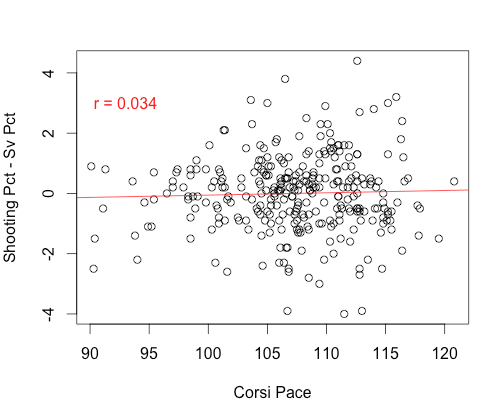I looked at team-level data since the 2004-2005 lockout, compiling each team’s Corsi For Percentage, Corsi Events For and Against Per 60 (Corsi Pace), as well as shooting and save percentage averages and differentials. Here is a graph of Corsi Pace versus team total shooting percentages (for and against added up).