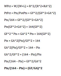 Log(Pts/(164-Pts)) = m * Log(GF/GA)