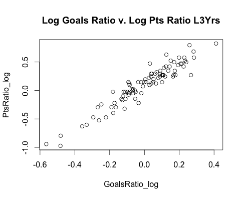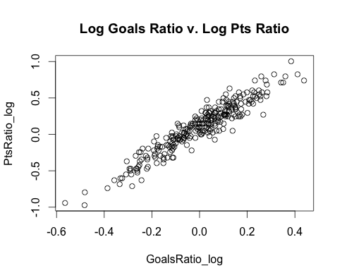 In order to find the appropriate value for m, we simply find the Log Points Ratio and Log Goals Ratio for each team in our dataset (which stretches back to 2005-2006, and from which we remove the partial 2013 season), and run a linear regression. You can see the connection between the two variables below.