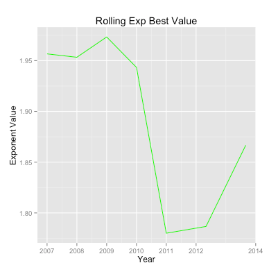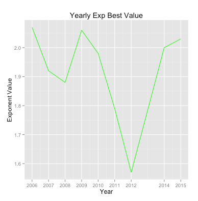 Once again, 2012 skews the data somewhat, but it’s clear that our initial study was accurate. The ideal exponent over the course of this data, and going forward, is likely in the range of 1.9. If you stretched the graph to 2015, that would be a value you could realistically expect to see.