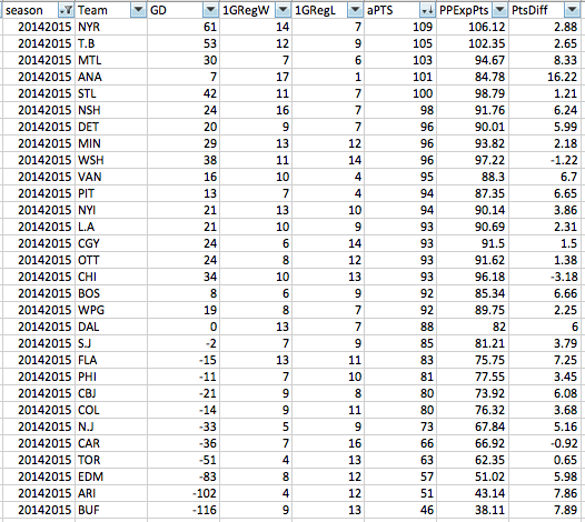 Since the last post was getting a little long, I decided to hold off on releasing the full Pythagorean results. Linked you will find a table of every team since the lost season, sorted by the difference between its adjusted point total and its Pythagorean expectation. Essentially, the teams that have the highest numbers in the right-most column are likely to have been the most fortunate, and those at the bottom were possibly unlucky. If you look at the 2014-2015 results below, you will see which teams should be a little bit worried about their chances, and those which may be ready for a rebound. Tomorrow, I will address what the point of this whole study was, and we’ll look at some more data.